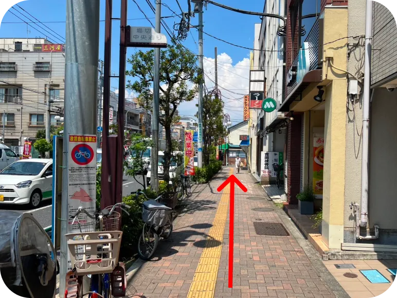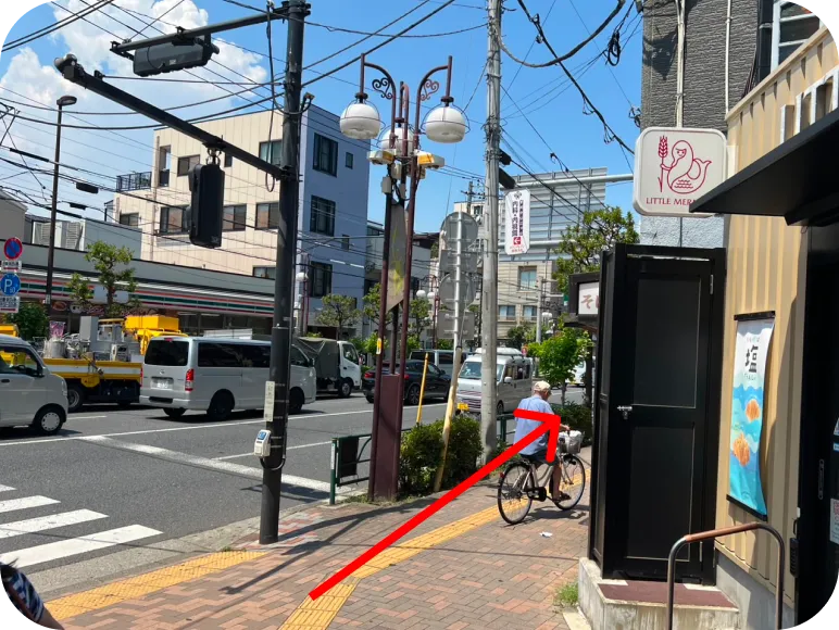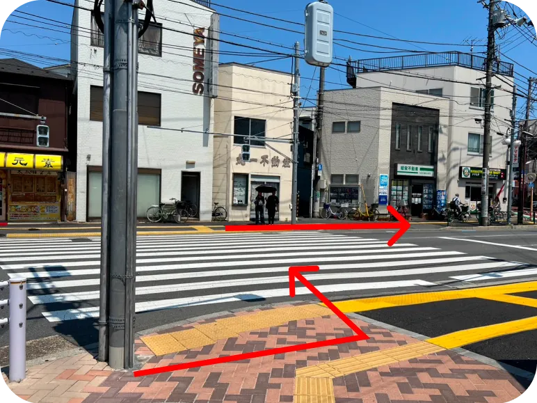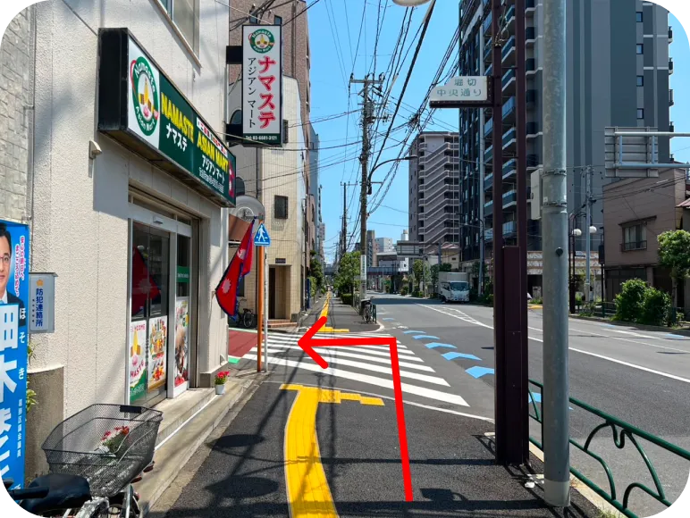 交差点を渡って右に10mほど進み、左の通りへ曲がります。